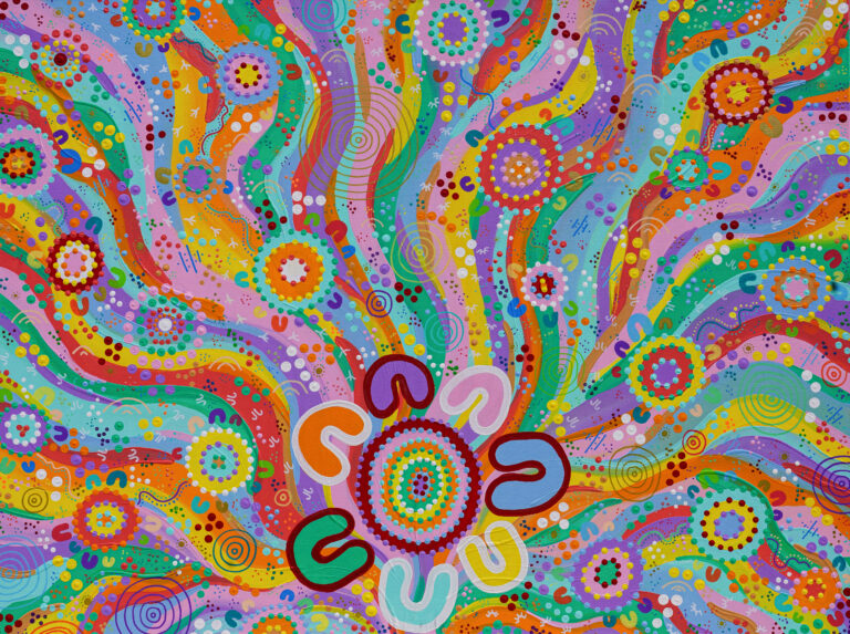 Through her combination of traditional dot painting, her hallmark use of colour, and contemporary style, Mali creates bright and magical artworks that aim to spread joy and positivity, encourage meaningful conversations, and share personal stories and worldly experiences.